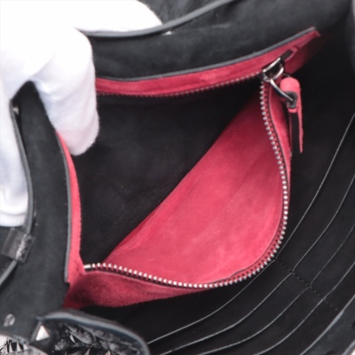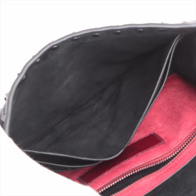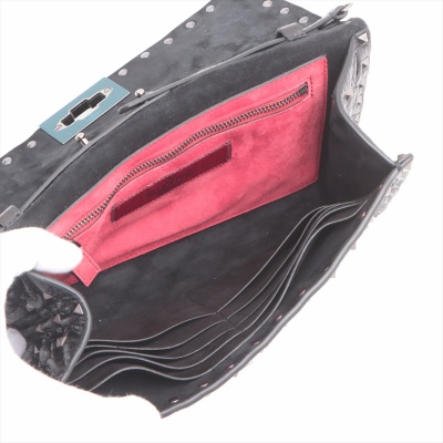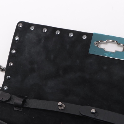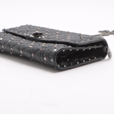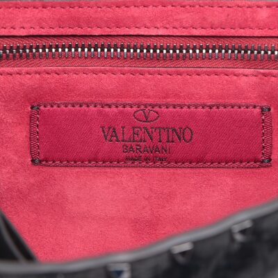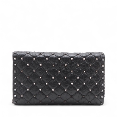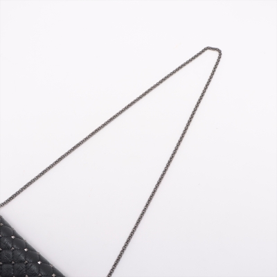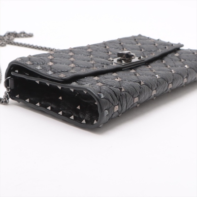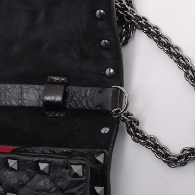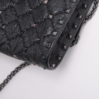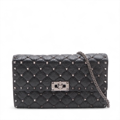 Valentino Garavani Rockstud Wallet on Chain in black aged Nappa leather. Featuring shiny black-toned hardware, small stud embellishments, and chain shoulder strap. The flap with turn lock closure opens to a black suede interior with card slots and red suede zip pocket. Approximate dimensions: 23cm(L) x 14cm(H) x 4cm(D), strap drop 53cm. Accompanied by Valentino Garavani dustbag. With Entrupy Certificate of Authenticity. (Pre-owned)