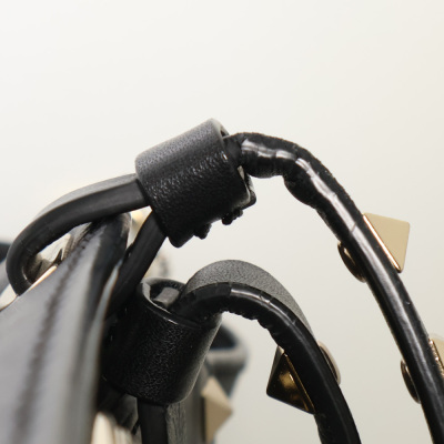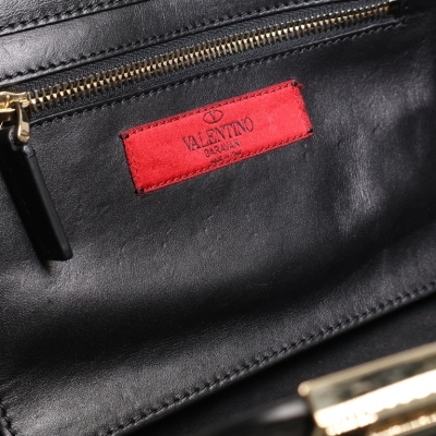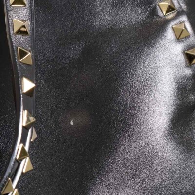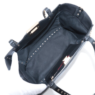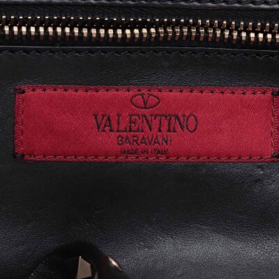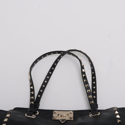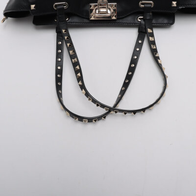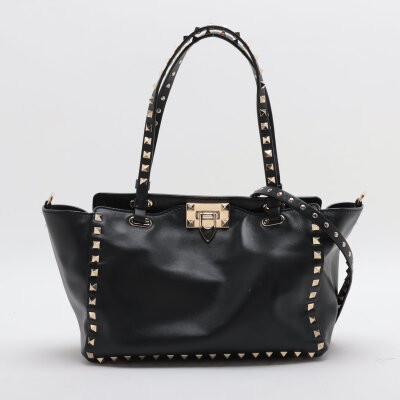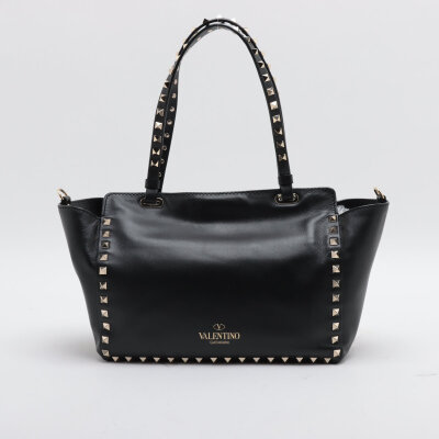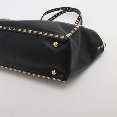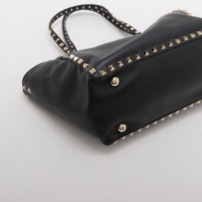 Valentino Garavani small Rockstud tote bag in black smooth calfskin leather. Featuring gold-toned studs and hardware, pyramid studs lining borders of the bag body, handles, and detachable strap. The switch-lock closure opens to a black textile interior with a hanging leather zipper pocket. Approximate dimensions: 26cm(base-W) x 18cm(H) x 10cm(D), with a 20cm handle drop and 45cm strap drop. Accompanied by Valentino care card and dustbag. With Entrupy Certificate of Authenticity.