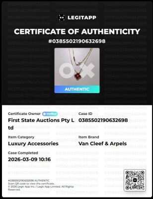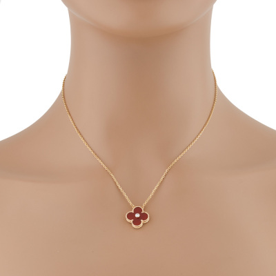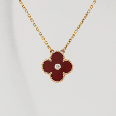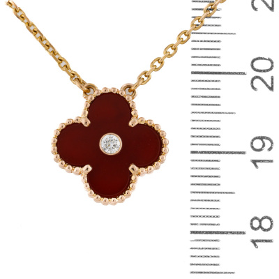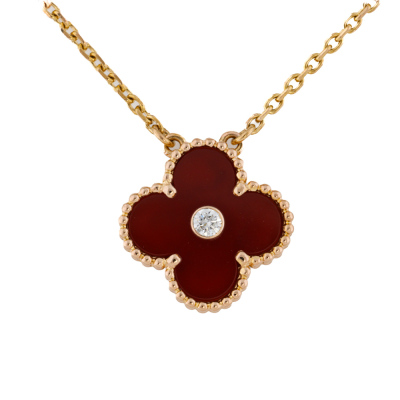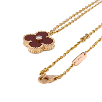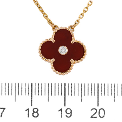 Van Cleef & Arpels 2011 Holiday Vintage Alhambra Pendant, Limited Edition with Carnelian inlay and round Natural Diamond of 0.05ct. Motif size: 15mm. 18ct rose gold with Van Cleef & Arpels 18ct rose gold attached chain. Length: 37cm - 41.5cm. Weight: 6.5g.