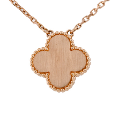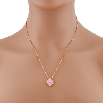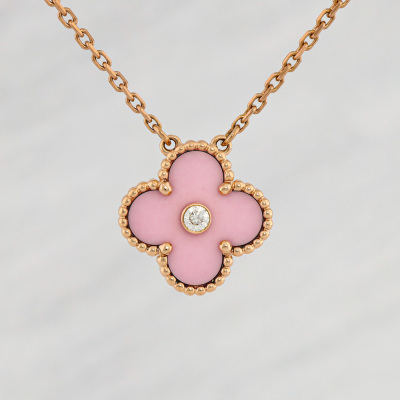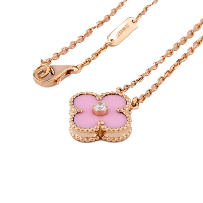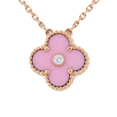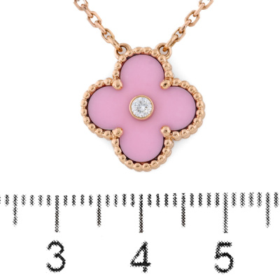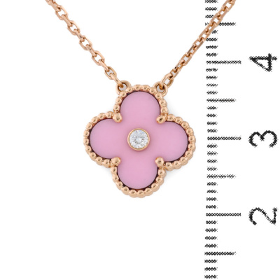 Van Cleef & Arpels 2015 Holiday Pendant, Limited Edition. Vintage Alhambra motif with pink porcelain inlay and a round Natural Diamond of approximately 0.05ct. Vintage Alhambra motif size: 15mm. 18ct rose gold with Van Cleef & Arpels 18ct rose gold attached chain. Length: 42.5cm - 47cm. Weight: 6.9g. With Certificate #7093499620221873. (Pre-owned)