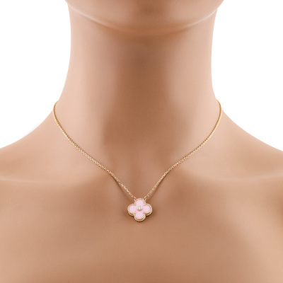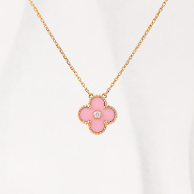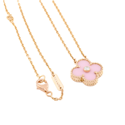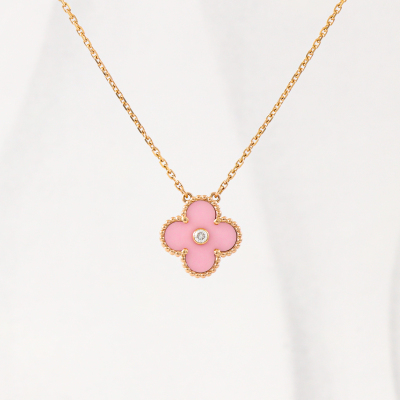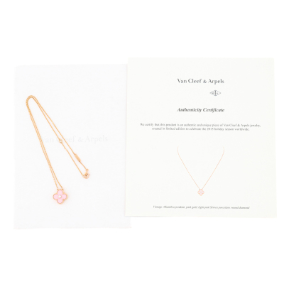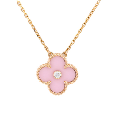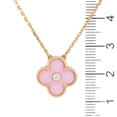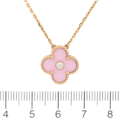 Van Cleef & Arpels 2015 Holiday Vintage Alhambra Pendant, Limited Edition with pink porcelain inlay and a round Natural Diamond of approximately 0.06ct. Vintage Alhambra motif size: 15mm. 18ct rose gold with Van Cleef & Arpels 18ct rose gold attached chain. Length: 37.5cm - 42cm. Weight: 6.2g. With Van Cleef & Arpels Authenticity Certificate dated 21/09/2015 and Van Cleef & Arpels box.