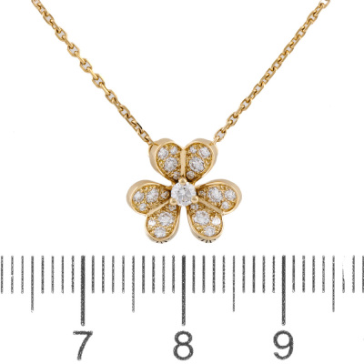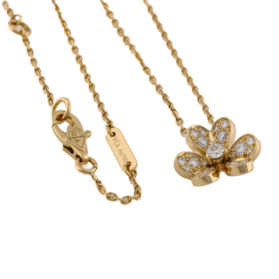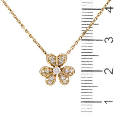 Van Cleef & Arpels Frivole pendant, mini model with 25 round Natural Diamonds totalling 0.21ct. Motif size: 10.3mm. 18ct yellow gold with Van Cleef & Arpels 18ct yellow gold attached chain. Adjustable length: 38.5cm - 40.0cm With certificate #4921755404363706