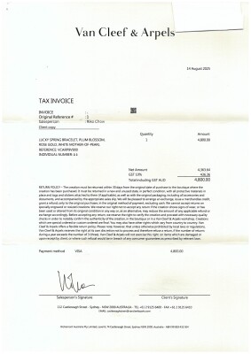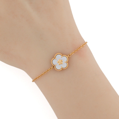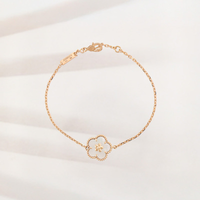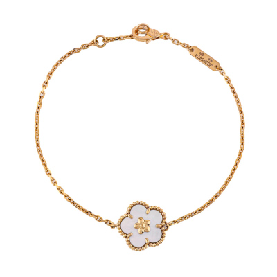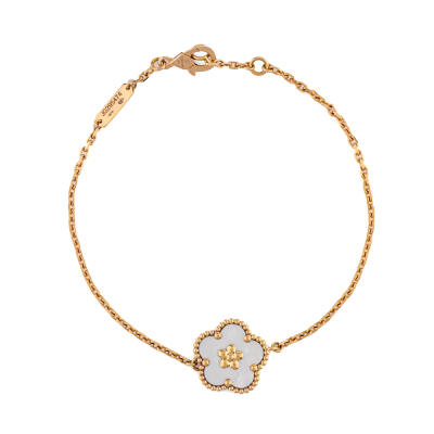 Van Cleef & Arpels Lucky Spring bracelet, plum blossom, with white Mother of Pearl inlay. 18ct rose gold. Motif size: 13.8mm. Adjustable length: 17cm - 18.5cm. With Van Cleef & Arpels Authenticity Certificate dated 14/08/25, Van Cleep & Arpels Tax Invoice dated 14/08/25, Van Cleef & Arpels box, care booklet and cleaning kit