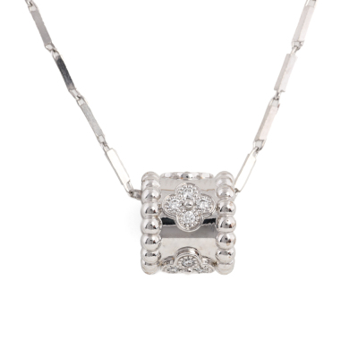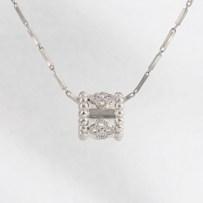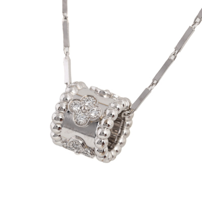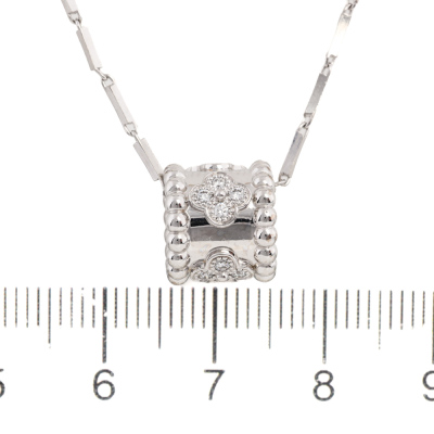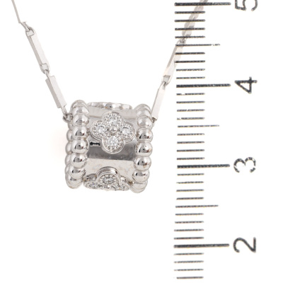 Van Cleef & Arpels Perlee Clovers pendant, mini model with 16 round Natural Diamonds totalling 0.18ct (Estimated grading: F VS). Motif size: 9.7 x 10.5mm. 18ct white gold with non branded platinum chain. Length: 40.5cm. Weight: 9.6g. With Van Cleef box, receipt & certificate dated: 29/06/2025. (Pre-owned)
