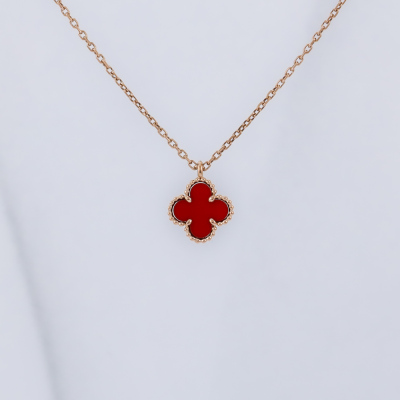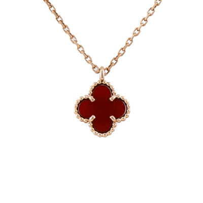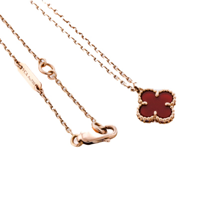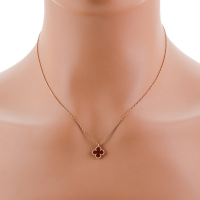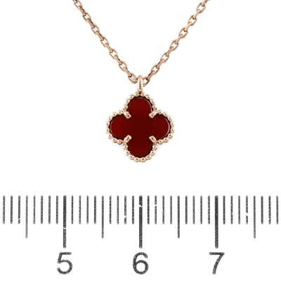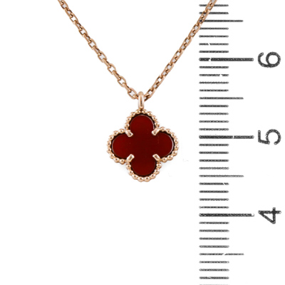 Van Cleef & Arpels Sweet Alhambra pendant with Carnelian. Motif size: 9.5mm. 18ct rose gold with Van Cleef & Arpels 39cm - 41cm 18ct rose gold adjustable chain. Weight: 2.7g. (Pre-owned)
