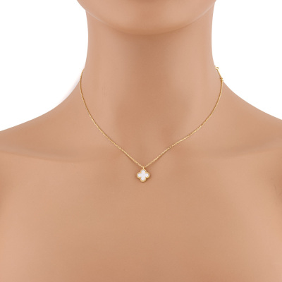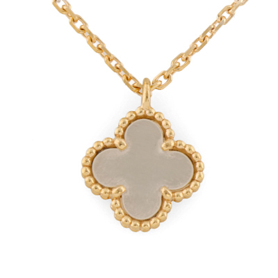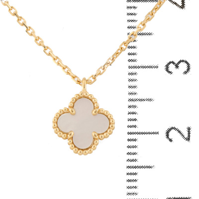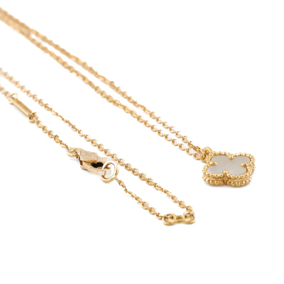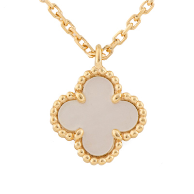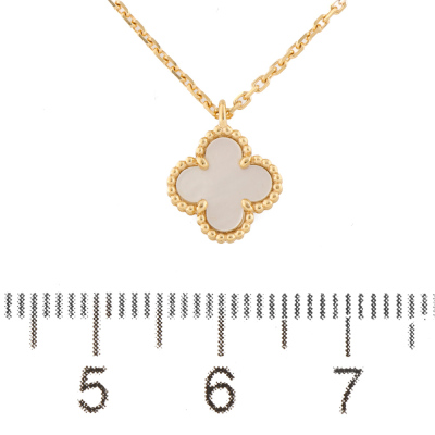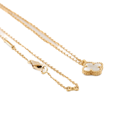 Van Cleef & Arpels Sweet Alhambra pendant with Mother of Pearl four-leaf clover motif of size 9.5mm. Van Cleef & Arpels 18ct yellow gold with 38cm - 40cm 18ct yellow gold chain. Weight: 2.9g. With Van Cleef & Arpels Box. (Pre-owned)