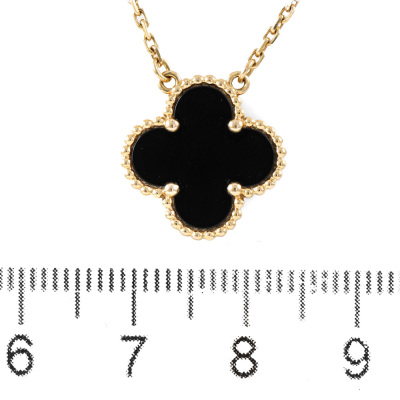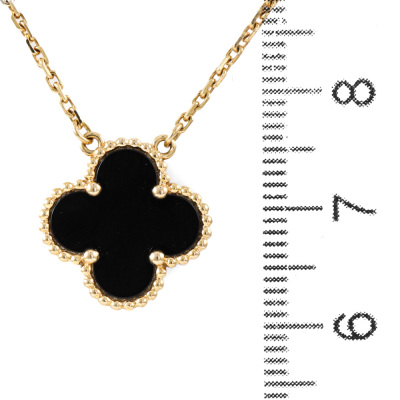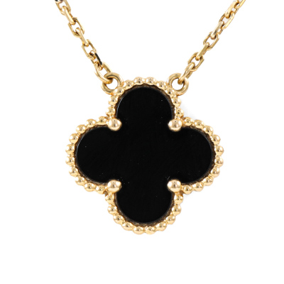 Van Cleef & Arpels Vintage Alhambra pendant with Onyx inlay. Motif size: 15mm. 18ct yellow gold with Van Cleef & Arpels 18ct yellow gold attached chain. Length: 37.5cm - 42cm. Weight: 5.4g. (Pre-owned)