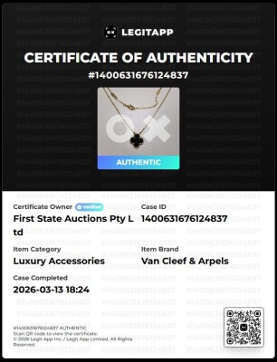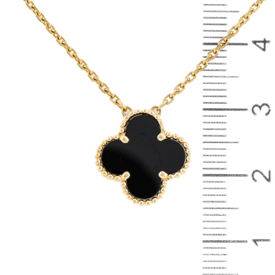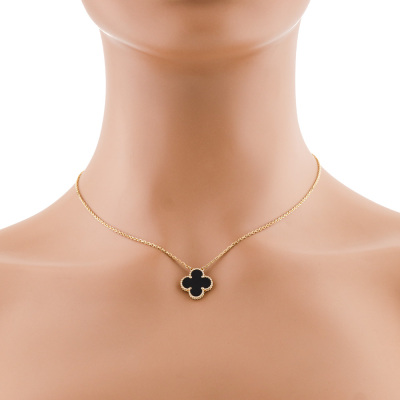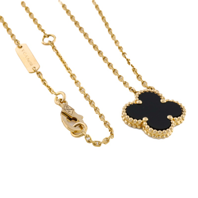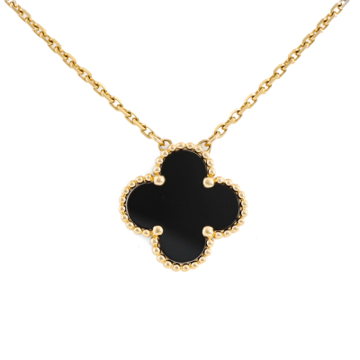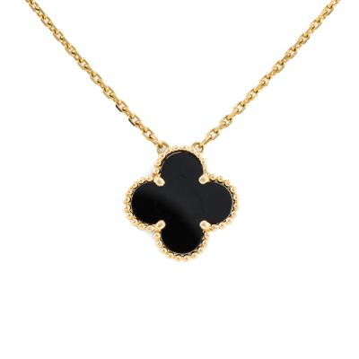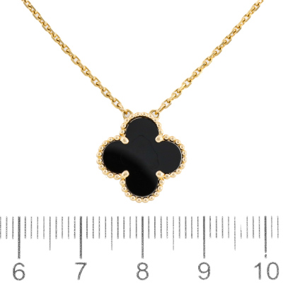 Van Cleef & Arpels Vintage Alhambra pendant with Onyx inlay. Motif size: 15mm. 18ct yellow gold with Van Cleef & Arpels 18ct yellow gold adjustable chain. Length: 37.5cm - 42cm. Weight: 4.9g. With certificate #1400631676124837