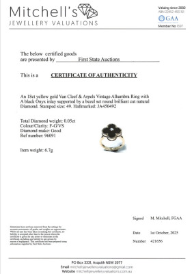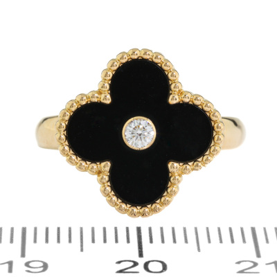 Van Cleef & Arpels Vintage Alhambra ring with Onyx inlay and a round Diamond of 0.05ct. 18ct yellow gold. Van Cleef stamped size 49, measures as Australian size: I 1/2 - ring resizing is not recommended. Band width: 2.4mm - 3.3mm. Weight: 6.7g. With Certificate #421656. (Pre-owned)