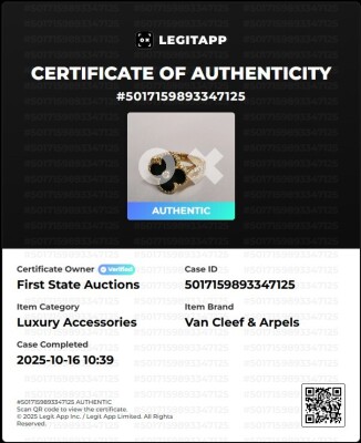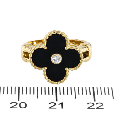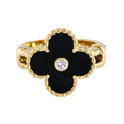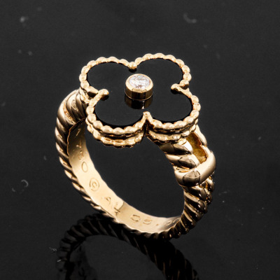 Van Cleef & Arpels Vintage Alhambra ring with Onyx inlay and a round Diamond of 0.06ct. 18ct yellow gold. Ring size I 1/2 - ring resizing is not recommended. Weight: 7.3g. With Van Cleef & Arpels box. With Certificate #5017159893347125 (Pre-owned)