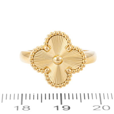 Van Cleef & Arpels Vintage Alhambra Guilloche ring. 18ct yellow gold. Motif size: 15mm. Van Cleef stamped size 53, measures as Australian size: M. Weight: 7.8g. With Van Cleef & Arpels box. With Van Cleef papers and Receipt dated 31/05/2025.