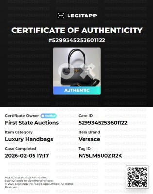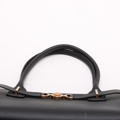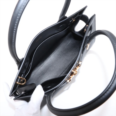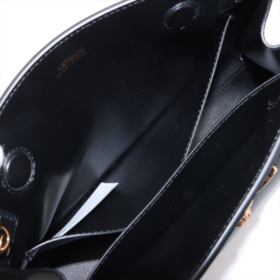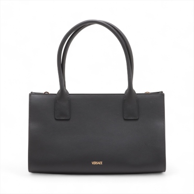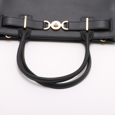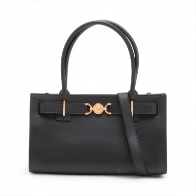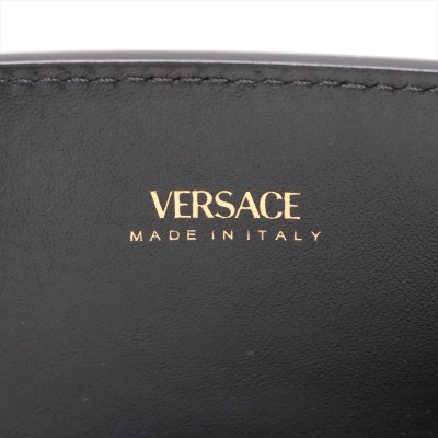 Versace Medusa 95 bag in black smooth calfskin leather. Featuring Medusa plaque detail with gold-toned hardware at front, tall rolled top handles, and a detachable shoulder strap. The magnetic fastening opens to a main compartment with two slip pockets. Approx dimensions: 31cm(W) x 18cm(H) x 8cm(D), 16cm handle drop, and a 50cm adjustable strap drop. Accompanied by a Versace care card and dustbag. With LegitApp Authentication Certificate.