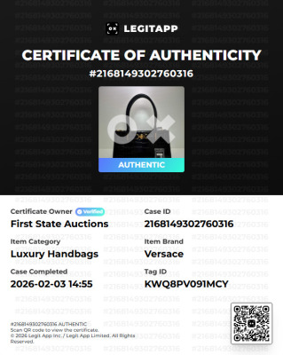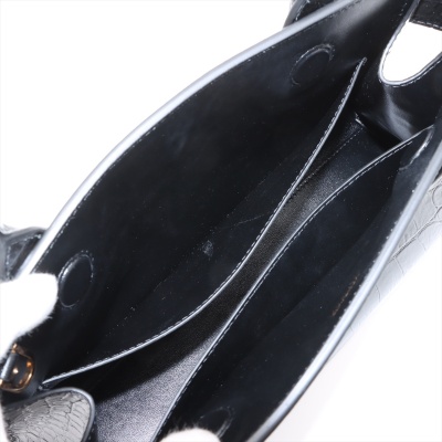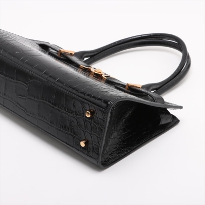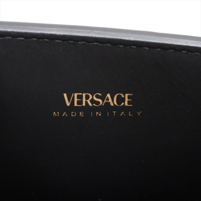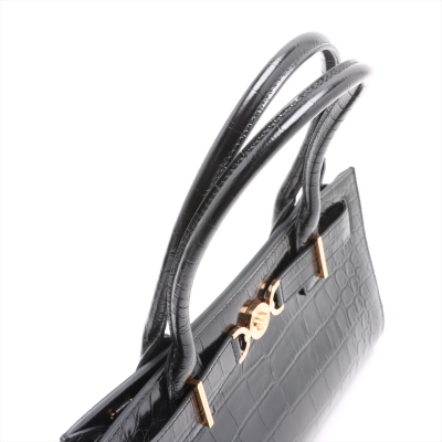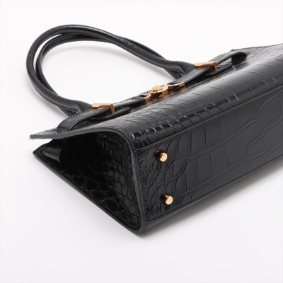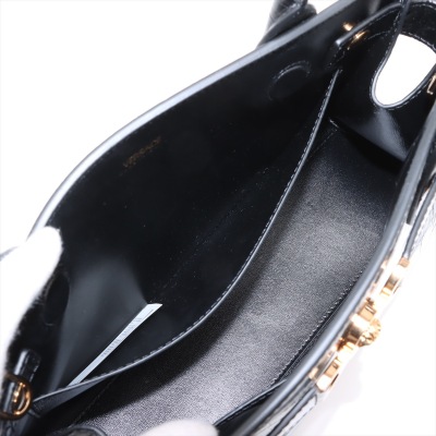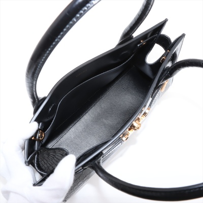 Versace Medusa 95 top handle bag in shiny croc-effect black calfskin leather. Featuring Medusa plaque detail with gold-toned hardware at front, tall rolled top handles, and a detachable shoulder strap. The magnetic fastening opens to a main compartment with two slip pockets. Approx dimensions: 31cm(W) x 18cm(H) x 8cm(D), 16cm handle drop, and 55cm adjustable strap drop. Accompanied by a Versace dustbag. With LegitApp Authentication Certificate..