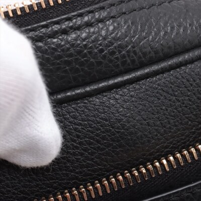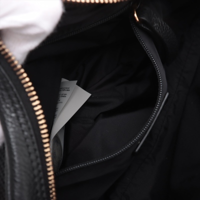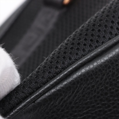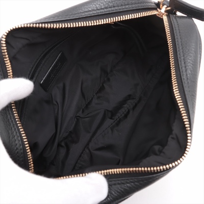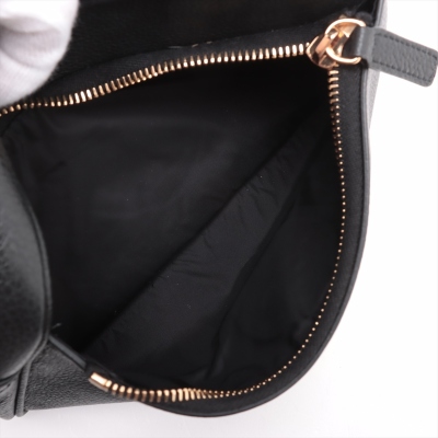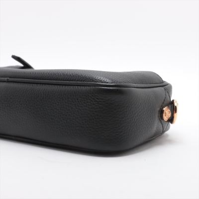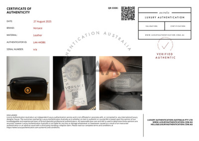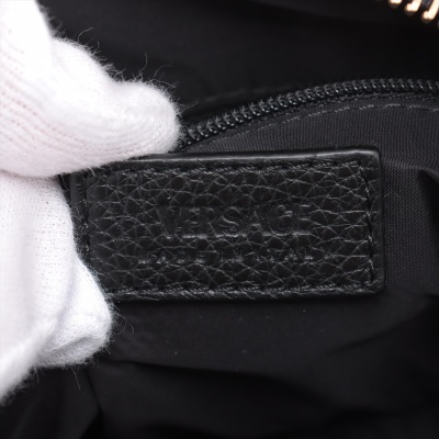 Versace Medusa front pocket 2way bag in black grained calfskin leather and thick mesh back. Featuring gold-toned hardware, front external zip pocket, and Medusa logo at front. The zip top opens to a black nylon interior with a zip pocket. Approximate dimensions: 22cm(L) x 14cm(H) x 6cm(D), convertible shoulder to belt strap drop 66cm. Accompanied by Versace dustbag. With Luxury Authentication Australia Certificate of Authenticity. (Pre-owned)