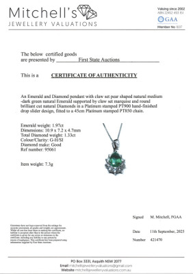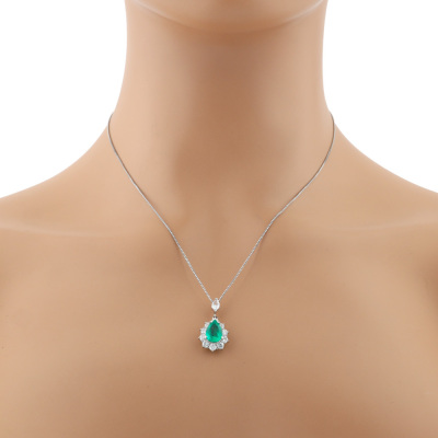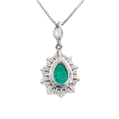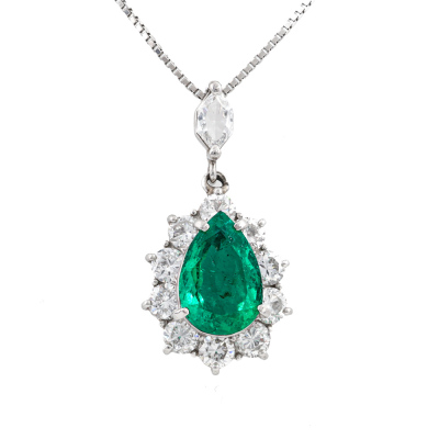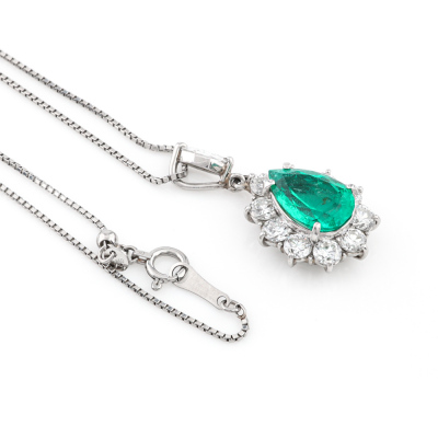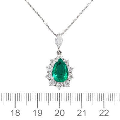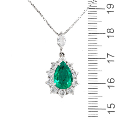 Emerald and Diamond pendant with centre pear shape Natural Emerald of 1.97ct and 10 round & 1 elongated hexagonal cut Natural Diamonds totalling 1.33ct (Estimated grading: G-H SI). Platinum - 900 with 45cm Platinum - 850 adjustable chain. Weight: 7.3g. With Certificate #421470. (Pre-owned)