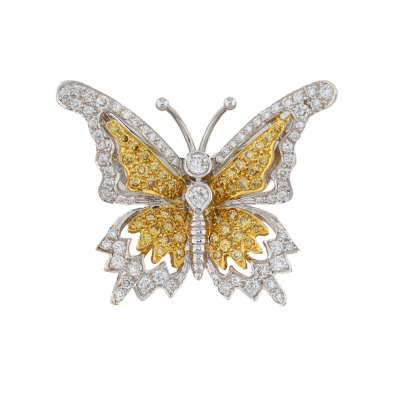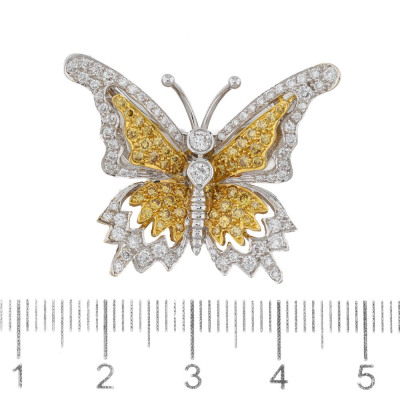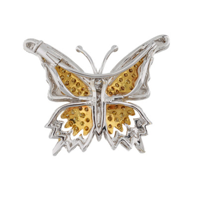Butterfly design brooch/pendant with round Natural Yellow Diamonds totalling 0.58ct (Estimated grading: Fancy Yellow SI) and round Natural white Diamonds totalling 0.76ct (Estimated grading: G-H VS-SI). 18ct white gold and yellow gold. Dimensions: 3.2cm x 2.6cm. Weight: 7.5g.