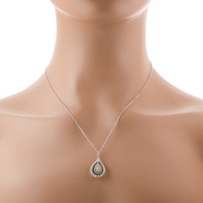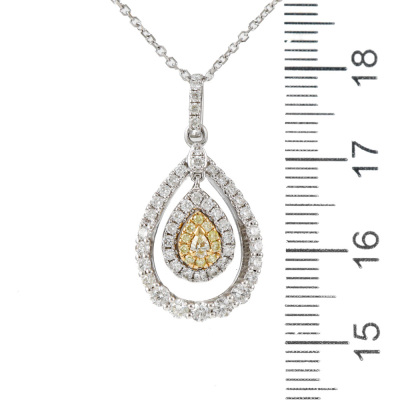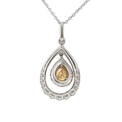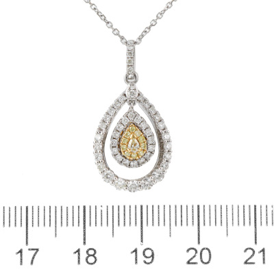 Diamond pendant with centre round & pear shape Natural Yellow Diamond totalling 0.046ct and remaining round Diamonds totalling 0.73cts (Estimated grading for all Diamonds: Fancy Yellow & G-H P1). 18ct yellow and white gold with 46cm 18ct white gold chain. Weigh: 4.4g.