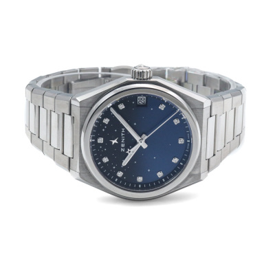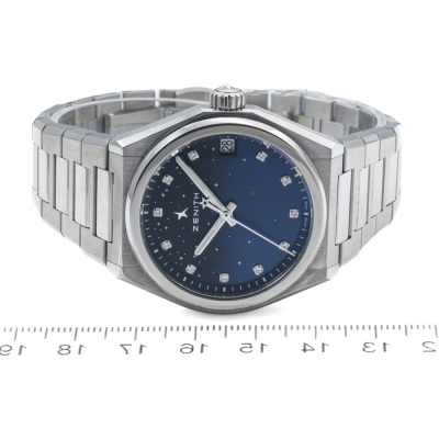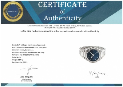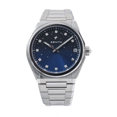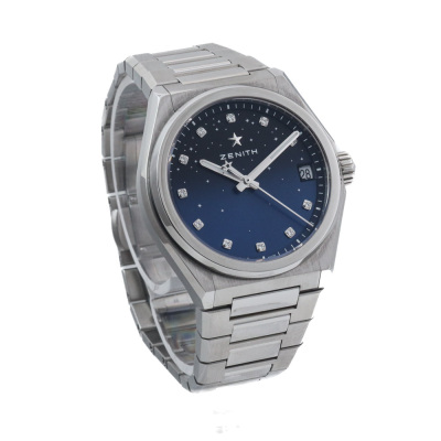 Zenith Defy Midnight stainless steel automatic watch. Blue dial, Diamond indicators, date, case diameter: 36mm, wrist size: 17cm, Swiss made. Ref# 03.9200.670/01.MI001. With Zenith stainless steel bracelet and clasp. With Certificate of Authenticity, Zenith International Warranty card dated 09/10/2022, Zenith 3 spare strap with 1 spare clasp and Zenith box. 3 month FSA warranty (Pre-owned)