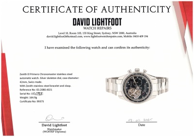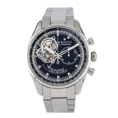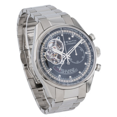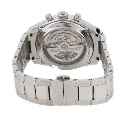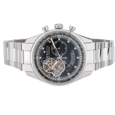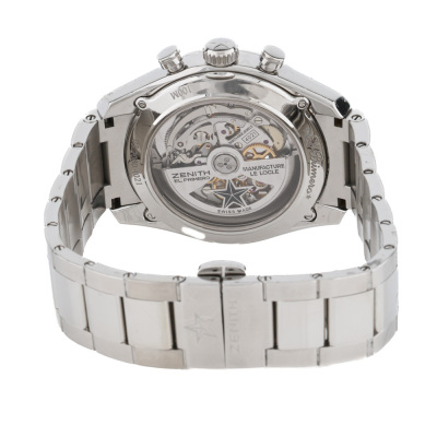 Zenith El Primero Open Power Reserve Chronomaster stainless steel automatic mens watch. Silver skeleton dial, case diameter: 42mm, wrist size: 19.5cm, Swiss made. Ref# 03.2080.4021. With Zenith stainless steel bracelet and clasp. With Certificate of Authenticity. 3 month FSA warranty. Weight: 164.9g (Pre-owned)